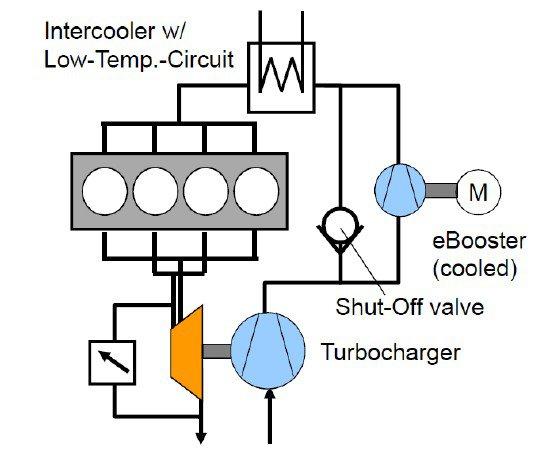 據了解,eBooster ® 電子增壓器集成了電子器件,由電機驅動,目前其第一代產品需與渦輪增壓器共同工作。以下游布局 eBooster ® 為例,在最初的怠速階段,僅有渦輪增壓器進行工作,空氣進入渦輪增壓器壓縮后進入發動機。當汽車處于加速、爬坡或其他瞬態發動機增壓工況時,閥門打開,空氣經由渦輪增壓器壓縮,進入 eBooster ®,最后再進入發動機。當發動機表現達到穩定的需求狀況時,eBooster ® 就會停止運轉,全部空氣受到渦輪增壓器增壓后即進入發動機。