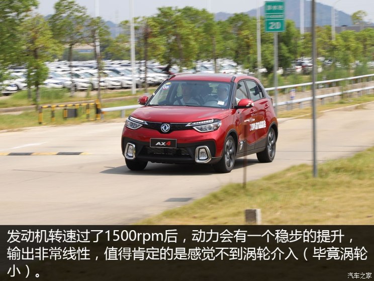 我把這次簡單的體驗分為兩部分,一是動力、底盤部分,第二個是車內噪音部分。我們先說說實際動力體驗。小排量發動機有很強推背感是不現實的(此結論僅限于量產車),哪怕是渦輪加持也不會很明顯,這臺1.0T的東風風神AX4同樣如此。因為在1500rpm渦輪開始介入,所以從靜止到節氣門全開,前20%的行程不會帶來很強的動力輸出,基本跟普通的1.5L自吸發動機感覺類似。