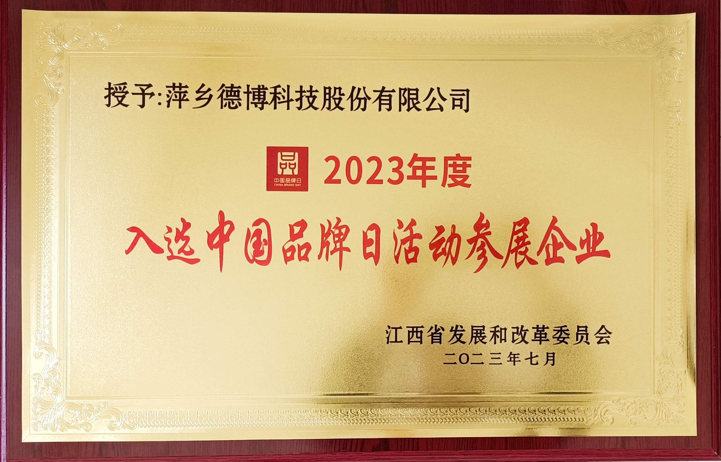 經江西省發展和改革委員會授予我司“2023年度入選中國品牌日活動參展企業”